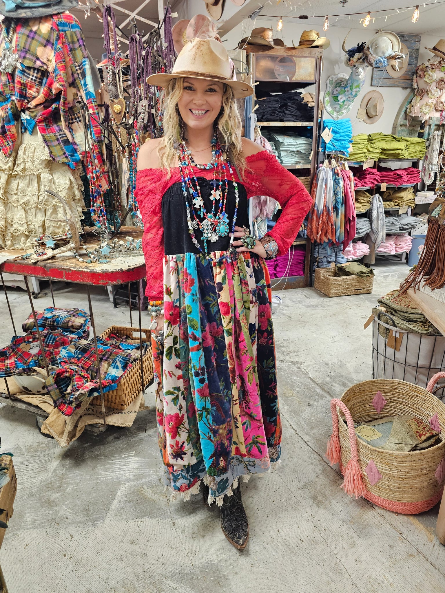 A true Rare Bird masterpiece, this luxurious piece is as versatile as it is stunning. Crafted from multiple strips of richly patterned velvet--each with their own story, texture and hue---it flows together in a romantic, bohemian cascade that catches the light with every step. The vertical strip work creates a long lean silhouette, making it slimming and flattering. Wear it high on the waist as a dramatic skirt or pull it up as a strapless dress. One size fits all this is perfect layered with a jackets, shirts, with boots and pure Rare Bird Magical jewelry.